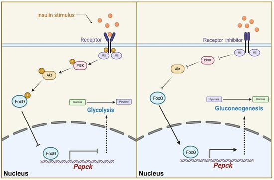 A diagram illustrating how the insulin signaling pathway regulates glucose homeostasis via FoxO-Pepck axis. When the insulin signaling pathway is activated, phosphorylated Akt (p-Akt) reduces FoxO activity by phosphorylating FoxO. This action decreases the transcription of Pepck, resulting in the activation of glycolysis and a decrease in glucose levels. Conversely, when the insulin signaling pathway is inhibited, Akt activity is suppressed, allowing FoxO to translocate into the nucleus. This facilitates the transcription of Pepck, leading to the activation of gluconeogenesis and an increase in glucose levels.