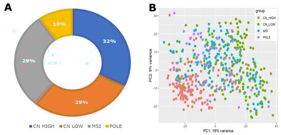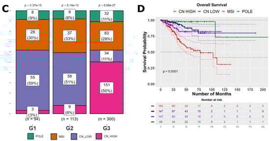 Endometrial cancer (EC) is one of the most common malignancies of female genitalia and second, after cervical cancer, worldwide []. Rising EC incidence and mortality rate are major concerns for women, particularly in countries experiencing socioeconomic transitions []. The majority of EC patients are elderly women (postmenopausal), particularly those who are in their sixth and seventh decades of life []. For over three decades, EC has typically been distinguished into type I and type II []. These two classifications differ in terms of epidemiology, histology, prognosis, and treatment [,]. Type I ECs are more prevalent, accounting for 80% of diagnosed EC cases, offer favourable prognosis with a 5-year overall survival (OS) rate of 81.3%, and have a recurrence risk of less than 20% [,]. Type II ECs are majorly diagnosed at a relatively advanced stage, associated with intermediate-to-poor prognosis with a 5-year OS rate of 55%, and have a high recurrence risk. In recent years, the rapid growth of array- and sequencing-based technologies, coupled with significant advancements in bioinformatics, has revolutionized the landscape of medical research []. These developments have enabled researchers to explore the intricacies of the human genome and unlock invaluable insights for understanding and treating complex diseases [,,,,,]. Based on array- and sequencing-based technology, EC has been further classified into four distinct molecular-based subgroups: (i) polymerase ε (POLE) ultra-mutated, (ii) microsatellite instability (MSI) hyper-mutated, (iii) copy-number low (CN LOW), and (iv) copy-number high (CN HIGH) [,]. Among these subgroups, POLE mutated shows the best prognosis, followed by MSI, copy-number low, and copy-number high, which has the poorest prognosis []. The recent molecular and genomic classification of EC has significantly improved its prognosis and led to the approval of new systemic therapies, as well as the development of precision medicine, resulting in therapeutic advancements and continual adjustments in EC patients’ management. Despite these advances, poorer outcomes are still associated with high-grade, metastatic, and recurrent EC.