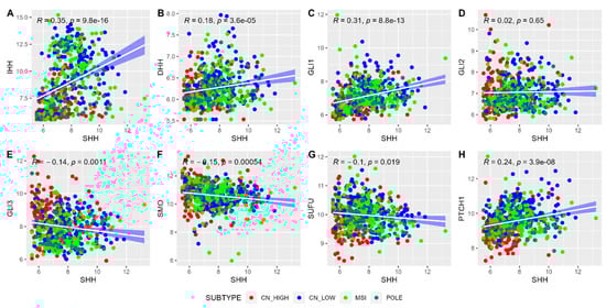 The correlation analysis of genes in the Sonic Hedgehog pathway with transcript expression of SHH gene. Each point on the scatterplot represents a specific gene in the SHH pathway, with the x-axis denoting the expression levels of these genes, and the y-axis indicating the expression level of the SHH gene. The plot illustrates the strength and direction of the correlation between SHH and the other genes in the pathway. The pattern of points on the plot reveals whether the expression of SHH correlates positively, negatively, or not at all with the expression of other genes within the SHH pathway.