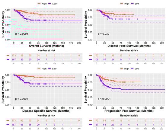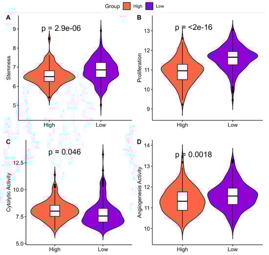The proliferation score is a key molecular measure in cancer assessment, reflecting how quickly cancer cells divide. High scores indicate aggressive, fast-growing tumors, while low scores suggest slower growth. It guides treatment decisions, calculated from three markers: MKI67, MCM6, and PCNA, helping tailor therapies for better outcomes [,]. Angiogenesis, the process of new blood vessel formation, plays a critical role in tumor growth and metastasis by supplying nutrients and oxygen to cancer cells [,]. The angiogenesis score was calculated using markers PECAM1, VEGFA, ANG2, CD105, FGF, and PDGF, which are key regulators of this process in the tumor microenvironment [].