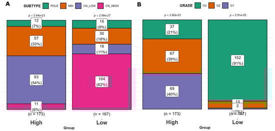 The distribution of the ‘High SHH’ group within the molecular subtypes of EC was as follows: CN HIGH (6%), CN LOW (54%), POLE (7%), and MSI (33%). In contrast, the ‘Low SHH’ group of EC tumors exhibited a different distribution among these subtypes: CN HIGH (62%), CN LOW (11%), POLE (9%), and MSI (18%) (Figure 4A). When considering tumor grade, the ‘High SHH’ EC tumors showed the following grade distribution: Grade 1 (40%), Grade 2 (39%), and Grade 3 (21%). On the other hand, the ‘Low SHH’ EC tumors were distributed as follows: Grade 1 (1%), Grade 2 (6%), and Grade 3 (91%) (Figure 4B). This analysis unveils noteworthy trends. The ‘Low SHH’ group consists of a higher proportion of samples from the CN HIGH subtype, which is associated with poor prognosis. In contrast, the ‘High SHH’ group is more prevalent in the CN LOW, POLE, and MSI subtypes. Additionally, the ‘Low SHH’ group is characterized by a notable predominance of high-grade tumors, while the ‘High SHH’ group exhibits a higher representation of lower-grade tumors. These findings underscore the potential clinical relevance of SHH groups in the context of tumor subtypes and grades, which may have implications for prognosis and therapeutic strategies.