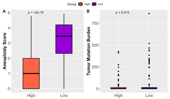 The genetic alterations in the samples were determined by two parameters: Tumor Mutational Burden (TMB) and aneuploidy. Aneuploidy, the presence of an abnormal number of chromosomes, is a hallmark of cancer that contributes to genomic instability and tumor progression []. TMB is the total number of mutations per coding region of a tumor genome. The TMB score was calculated by assessing the number of nonsynonymous mutations in the tumor’s exome, thereby providing insight into the tumor’s genetic instability []. The details regarding Aneuploidy and TMB for each sample were collected from TCGA database.