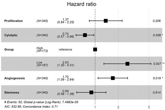 We employed a Cox proportional hazards model to investigate the impact of multiple variables on survival outcomes in the cohort of EC (Figure 9). The results of the Cox proportional hazards regression analysis reveal several significant associations between clinical and molecular characteristics and overall survival in the cohort. Notably, individuals categorized in the ‘Low SHH’ had a significantly higher hazard of experiencing the event of interest, with a hazard ratio of 2.63 and a significant p-value (p = 0.007), indicating its strong association with adverse outcomes. Cytolytic activity emerges as another notable factor, with a hazard ratio of 0.7384 (p = 0.026). This suggests that higher cytolytic activity is associated with a decreased risk of adverse outcomes, highlighting its potential role in improving patient survival. Angiogenesis with a hazard ratio of 1.70 (p = 0.019) suggests that increased angiogenesis is linked to a higher risk of adverse outcomes. Proliferation and stemness did not show statistically significant associations with survival in this analysis. However, there was a trend suggesting that higher levels of these factors may be associated with adverse outcomes. The model displayed a concordance value of 0.71, indicating a reasonable ability to discriminate between different survival times. Additionally, the likelihood ratio, Wald, and Score (logrank) tests collectively affirmed the statistical significance of the model (p < 0.001), signifying that at least one predictor significantly influences survival. These findings provide valuable insights into the factors affecting survival in this cohort and underscore the relevance of the ‘Low SHH’ variable as a robust predictor of adverse outcomes.