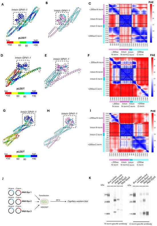 In silico predictions of intein residue interactions and validation of midi-Dys intein PTS. (A) Predicted structure of GP41-1 intein and midi-Dys 1 200aa around the split sites colored by pLDDT. (B) The same prediction colored by a structured protein chain. GP41-1 intein is highlighted by a square box. (C) PAE matrix highlighting the predicted error of interaction between the intermolecular domains. (D) Predicted structure of GP41-1 intein and midi-Dys 2 200aa around the split sites. (E) The same prediction colored by chain. (F) PAE matrix highlighting the predicted error of interaction between the N-terminal chain and the C-terminal chain. (G) Predicted structure of GP41-1 intein and midi-Dys 3 200aa around the split. (H) The same prediction colored by chain sites. For (A,D,G): the structures are colored by pLDDT (red, 0–50; yellow, 50–60; green, 60–80; cyan, 80–90 and blue, more than 90). For (B,E,H): GP41-1 intein is inside a square box. Light pink: −200aa region; pink: N-term GP41-1 intein; blue: C-term intein; light blue: +200aa region. (I) PAE matrix highlighting the predicted error of interaction between the two split chains. (J) Schematic representations of midi-dystrophins lipofection in HEK293T and capillary Western blot. Created with BioRender.com. (K) Capillary Western blot of HEK293T lipofected with midi-Dys 1-2-3 with N-term and C-term specific antibody. Specific bands are visible at 280 kDa. Reconstituted midi-Dys 1-2 are visible around 220–230 kDa, while non-reconstituted midi-Dys 1-2-3 are visible around 120–130 kDa.