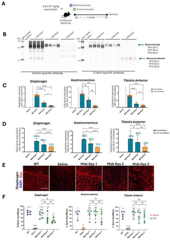 Efficacy of reconstitution of midi-dystrophins in Dba2-mdx mouse model. (A) Schematic representation of the in vivo protocol. One month old Dba2/mdx mice were injected with midi-Dys 1, midi-Dys 2, and midi-Dys 3 at a dose of 2.0 × 1013 vg/kg each vector (total dose 4.0 × 1013 vg/kg). Tissues were collected after 7 weeks from the intravenous injection. (B) The capillary Western blot of protein lysates of diaphragm at 7 weeks post-injection in Dba2-mdx mice with N-term and C-term specific antibodies. Reconstituted midi-Dys are visible around 200 kDa, while non-reconstituted midi-Dys are visible around 116 kDa. (C) TheQuantification of midi-Dys 1-2-3 and micro-Dys protein expression after capillary Western blot using N-term specific antibody in gastrocnemius, tibialis anterior, and diaphragm at 7 weeks post-injection in Dba2-mdx mice. Values are represented as normalized area under the curve (AUC). (D) The quantification of midi-Dys 1-2-3 (reconstituted and non-reconstituted) protein expression after capillary Western blot using C-term midi-Dys specific antibody in gastrocnemius, tibialis anterior, and diaphragm at 7 weeks post-injection in Dba2-mdx mice. Values are represented as normalized area under the curve (AUC). Blue values represent the percentage of reconstitution, calculated as the protein expression of reconstituted midi-Dys over the total. (E) Representative dystrophin IHF pictures of the diaphragm at 7 weeks post-injection in Dba2-mdx mice using N-term specific antibody. Scale bar = 100 µm (F) The quantification of dystrophin positive myofibers in gastrocnemius, tibialis anterior, and diaphragm at 7 weeks post-injection in Dba2-mdx mice. The percentage of dystrophin + fibers is represented of number of dystrophin positive fibers over fibers positive for laminin. For all the panels: N = 4–5. One-way ANOVA statistic test. * p < 0.05, ** p < 0.005, *** p < 0.001, **** p < 0.0001, ns = not significant.