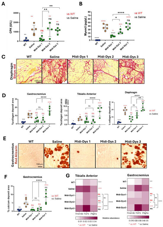 Functional and histopathological therapeutic efficacy in Dba2-mdx mice. (A) CPK (creatine phosphokinase) concentration in the sera of Dba2-mdx mice injected with midi-Dys 1-2-3. Results are shown as concentration defined units/liter (U/L). (B) Myom3 (Myomesin 3) concentration in the sera of Dba2-mdx mice injected with midi-Dys 1-2-3. Results are represented as Myom3 concentrations defined as pg/µL. (C) Representative images of Sirius red coloration in the diaphragm of Dba2-mdx mice 7 weeks post-injection. Red-colored regions are highly fibrotic and contain collagen deposits. (D) The quantification of collagen deposits area in gastrocnemius, tibialis anterior, and diaphragm at 7 weeks post-injection in Dba2-mdx mice. The results are shown as the percentage of collagen deposits area over the total area of the muscle cut. (E) Representative images of red Alizarin coloration in the gastrocnemius of Dba2-mdx mice 7 weeks post-injection. Red areas are indicated as a region containing calcium deposits. (F) The quantification of the calcium deposits area in the gastrocnemius of Dba-mdx injected mice. The results are shown as the percentage of calcium positive regions over the total area of the muscle cut. (G) Gene expression analysis of Tmem8c, TGF-β, and Pdgfr-α in tibialis anterior and gastrocnemius of WT mice and DBA2/mdx mice injected with saline, midi-Dys 1, midi-Dys 2, or midi-Dys 3. Results are shown as a heatmap of relative abundance of gene expression over P0 normalizer gene. For all the panels: N = 4–5. For panel (A–F): One-way ANOVA statistic test. * p < 0.05, ** p < 0.005, *** p < 0.001, **** p < 0.0001, ns = not significant. For panel (G): Two-way ANOVA statistic test and multiple comparisons with main row effect. * p < 0.05, ** p < 0.005, *** p < 0.001, **** p < 0.0001, ns = not significant.