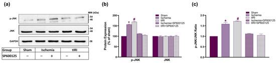 Rats were treated with the JNK inhibitor SP125600 (15 mg/kg intraperitoneally (i.p.); S1460; Selleck Chemicals, Houston, TX, USA) or 10% DMSO as a vehicle. The SP600125 dosage and mode of administration were chosen based on their use in previously published studies using rat IRI models with established statistically significant inhibition of JNK phosphorylation [13,57,58,59]. In the ischemia-only group, the drug was injected 30 min prior to the ischemic insult. In the tIRI group, the drug was injected 30 min after ischemia initiation. The drug injection time was based on the reported maximum serum availability and inhibitory effect of SP600125, which is 30 min after i.p. injection [60].