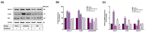 At the transcriptional level (Figure 2c), the relative mRNA expression of Becn1 and Lc3b was upregulated during testicular ischemic injury by 3.1- and 2-fold, respectively, while Sqstm1 (p62) mRNA expression was downregulated by 1.54-fold compared to the sham (p < 0.0001). JNK inhibition reversed this expression pattern to 1.54-fold downregulation for Becn1 and Lc3b and 1.6-fold upregulation for Sqstm1 mRNA (p < 0.0001). During tIRI, the transcription rate of the Becn1 and Lc3b genes was increased by 1.6- and 1.4-fold; however, Sqstm1 was decreased by 1.43-fold compared to the sham (p < 0.0001). SP600125 treatment during tIRI normalized Sqstm1 mRNA expression but downregulated that of Becn1 and Lc3b by 1.43- and 1.54-fold, respectively (p < 0.0001). This suggests that JNK is capable of directly regulating the mRNA expression of autophagy genes via activation of its downstream transcription factors.