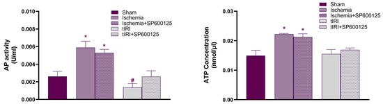 JNK modulates lysosomal alkaline phosphatase (AP) activity but not ATP levels. Biochemical colorimetric assay kits measured AP activity and ATP concentration in the 5 experimental groups. The data were analyzed using one-way analysis of variance (ANOVA) followed by the Holm–Sidak multiple comparisons test and presented as mean values ± SD (n = 6/group). * Ischemia compared to sham and # tIRI compared to sham.