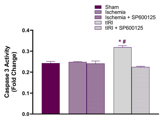 JNK modulates caspase 3 activity. Caspase 3 activity was measured using a colorimetric assay, and the fold change in ischemia-, tIRI-, and SP600125-treated groups was calibrated to sham activity. Data are presented as mean ± SD (n = 6/group), p-value < 0.05. * tIRI compared to ischemia and # tIRI compared to sham.