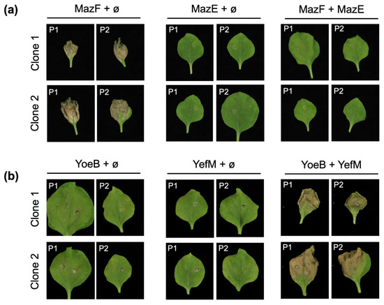 To explore the use of TA modules in plants for novel biotechnological applications, we selected two pairs of TA systems: MazEF from E. coli and YefM-YoeB from S. pneumoniae. These systems had previously been tested in Nicotiana tabacum and A. thaliana, respectively [14,19]. We synthesized the corresponding toxin genes for each system, introducing an intron in the middle of their sequences to prevent cloning issues in bacteria [21], and we also synthesized the cognate antitoxin genes. Plasmids were transformed into agrobacteria for the transient expression of the corresponding proteins. All plasmids were co-expressed with the RNA silencing suppressor P19 to maximize protein expression over time. We agroinfiltrated eight plants with the indicated mixtures (Figure 1), four plants per clone, and monitored them over time, up to 10 days post-agroinfiltration (dpa).