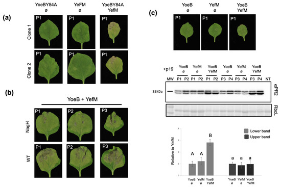 As anticipated, the expression of the MazF toxin induced a death phenotype, which was counteracted by the expression of the cognate MazE antitoxin. Additionally, the MazE antitoxin alone did not produce any necrotic effect (Figure 1a). This result was consistent with findings previously described in N. tabacum [14]. Surprisingly, for the YefM-YoeB system, the expression of the YoeB toxin, known to kill A. thaliana plants [16], or the YefM antitoxin did not produce any distinguishable phenotype. However, simultaneous expression of both proteins, which was harmless in A. thaliana [19], induced a death phenotype in the agroinfiltrated leaves similar to that observed in MazF-treated plants (Figure 1b). This result suggests that the toxin alone is not responsible for the death phenotype. Supporting this hypothesis, an experiment with an inactive mutant of the bacterial toxin yielded similar results. In this case, we synthesized an inactive YoeB toxin with a mutation in amino acid 84 (YoeBY84A) as described [22] and performed a comparable transient expression experiment in N. benthamiana plants. As before, expression of the mutant toxin or the antitoxin did not produce any notable phenotype in the agroinfiltrated area (Figure 2a).