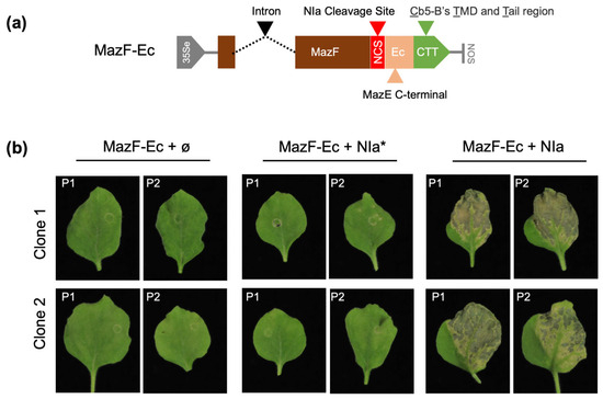 - Baldacci-Cresp, F.; Houbaert, A.; Metuor Dabire, A.; Mol, A.; Monteyne, D.; El Jaziri, M.; Van Melderen, L.; Baucher, M. Escherichia colimazEF Toxin-Antitoxin System as a Tool to Target Cell Ablation in Plants. J. Mol. Microbiol. Biotechnol. 2016, 26, 277–283. [Google Scholar] [CrossRef]
