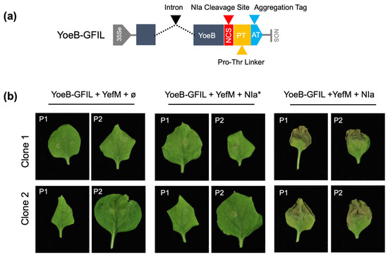 The results obtained with the YoeB toxin led us to seek a different method to design a molecular switch that could be activated by NIapro. In this case, the off position of the system could not be achieved through the expression of the antitoxin, as its expression is necessary for the necrotic response in the plant. Based on the hypothesis that the necrotic phenotype is triggered by the recognition of the complete TA protein complex, we engineered a method to keep both proteins physically separated by incorporating a C-terminal aggregation tag (AT) into the YoeB toxin. This tag consists of amino acids Gly-Phe-Ile-Leu (GFIL) expressed twice in tandem. Although this tag was described for bacteria [31], it had not been tested in plants. To facilitate aggregation, we included a rigid Pro/Thr linker before the tag (PT). A PPV-NIa cleavage site was inserted between YoeB and the PT linker (NCS) (YoeB-GFIL; Figure 4a).