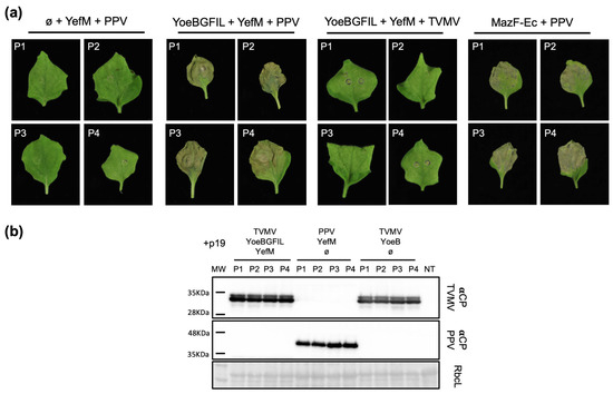 During a potyviral infection, NIapro is expressed under specific spatial–temporal conditions dictated by the virus’s needs [32]. Our results showed that two different bacterial TA systems were successfully adapted to induce a necrotic phenotype in N. benthamiana plants upon expression of NIa endopeptidase. Given this, we aimed to test whether the death phenotype could also be observed during a potyviral infection, laying the groundwork for the development of novel antiviral strategies. To this end, we performed agroinfiltration experiments in which we co-expressed YoeB-GFIL and YefM, or MazF-Ec, together with an infectious cDNA clone of PPV. As a negative control for the necrotic phenotype, we prepared an agroinfiltration mix in which YoeB-GFIL was substituted with an empty vector. To verify the specificity of the cleavage, we also prepared a YoeB-GFIL/YefM agroinfiltration mix in which the PPV clone was replaced with a cDNA clone for the expression of Tobacco vein mottling virus (TVMV), a closely related potyvirus that can infect Nicotiana plants. Eight plants were inoculated with each mix, and P19 was included in all cases to ensure the expression of the corresponding TA proteins (Figure 5).