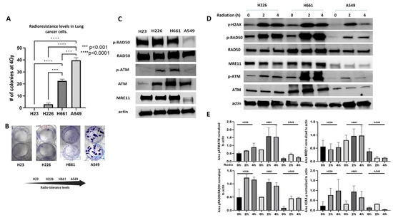 We assessed the endogenous radioresistance levels of lung cancer cells by colony formation assays and compared them with the phosphorylation levels of RAD50 and ATM, key components of the DDR activation after radiation [7]. First, lung cancer cell lines were chosen to model radiation response by clonogenic assays and survival fraction calculation. In our experiments, the H23 cells were the most sensitive, followed by the cell lines H226 and H661, with the most resistant being the A549 cells (Figure 1A,B). Surprisingly, lower p-RAD50 levels were detected in the A549 cells, the most radioresistance cell line evaluated. Interestingly, the expression of MRE11, another member of the MRN complex, was also decreased in A549 cells (Figure 1C). Since our data showed an association between radioresistance and inhibition of MRN complex signaling, indicating that cells intrinsically more radioresistant show lower phosphoactivation of the MRN complex, we hypothesized that a decreased MRN pathway signaling could lead to accumulation of DNA damage and aberrant mutations in the genome, which would increase malignancy and resistance to radiotherapy in lung cancer.