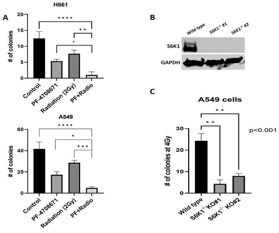 As the activation of S6K1 could have a role in radiation resistance in lung cancer, we studied the phospho-levels of S6K1 in our panel of cell lines. Our results indicated that S6K1 activation, measured by the phosphorylation in T389, was increased in the most endogenously radioresistant cells, A549 (Figure S1). Moreover, there was an increase in the phosphorylation of the ribosomal protein S6 (S6), the main known target for S6K1 kinase, in both resistant cells H661 and A549 (Figure S1). We also checked the levels of p-S6K1 after radiation and found the more radioresistant cells, A549 and H661, harbor the highest levels of activation of this target, while the most sensitive H23 cells have the lowest, confirming the association between the levels of activated S6K1 and radioresistance (Figure S2). To further evaluate the role of S6K1 in radioresistance, we pre-treated A549 and H661 cells with DMSO (control vehicle) or PF-4708671, a highly specific inhibitor of S6K1 and performed colony forming assays before and after radiation. PF-4708671 is a piperazinyl-pyrimidine analogue which was the first specific S6K1 inhibitor to be reported. It was shown that PF-4708671 suppresses the phosphorylation of the protein S6, while having little or no effect on other S6K1-related kinases [21]. While a decrease in colony formation in cells treated with PF-4708671 or radiation alone was observed, a more significant reduction was noted in cells pre-treated with PF-4708671 plus radiation, indicating that S6K1 inhibition sensitizes lung cancer cells to radiation (Figure 2A). To confirm that the radiosensitizing effects of PF-4708671 were due to the specific inhibition of S6K1 and not to off-target effects of the PF-4708671 inhibitor, we selected the most endogenously radioresistant A549 cells and deleted the S6K1 gene by Crispr-Cas9 (S6K1−/− KO (knockout) cells) for further clonogenic assays. First, we confirmed the genetic deletion of S6K1 by Western blotting (Figure 2B). As expected, the colony formation was dramatically decreased in two different clones of S6K1−/− KO cells compared to the wild type (p < 0.001) after radiation (Figure 2C). Although we observed a clear decrease in the colony number in non-radiated S6K1−/− cells compared to the wild type controls (Figure S3), the reduction in colonies in S6K1−/− cells plus radiation was far higher, showing that the S6K1 genomic deletion has, in fact, a radiosensitizing effect on lung cancer cells. Thus, this set of data confirms the pharmacological or genetic targeting of S6K1-sensitized lung cancer cells to radiotherapy.
