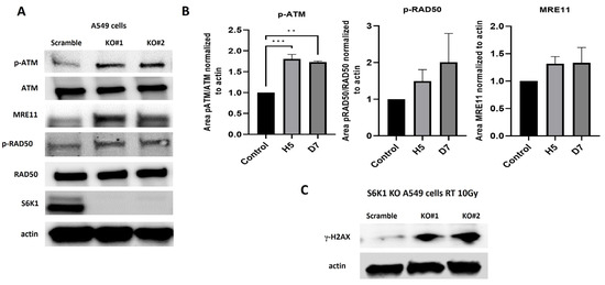 Our data showed that MRN complex signaling activation is diminished in cells that are more inherently radioresistant and that S6K1 inhibition cooperates to overcome resistance to radiation. Therefore, we hypothesize that a nexus between S6K1 and MRN could exist to promote radioresistance. To confirm this association, we analyzed the phosphoactivation of members of the MRN complex signaling in S6K1−/− A549 cells. Our results showed that S6K1−/− cells exhibited upregulation of p-ATM, p-RAD50 and MRE11 compared to wild type controls (Figure 3A,B), confirming the inhibitory role of S6K1 on MRN complex signaling. Moreover, irradiation was shown to cause more DNA damage signaling in S6K1−/− cells compared to controls, observed by a significant overexpression of the DNA damage marker γ-H2AX in KO cells after radiation (Figure 3C). Thus, our data confirmed that S6K1, at least partially, controls DNA damage by regulating MRN complex signaling.