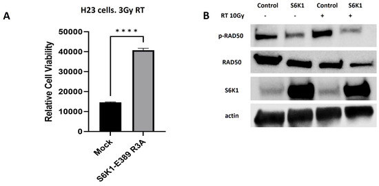 To confirm the regulatory role of S6K1 on the development of radioresistance, we overexpressed a constitutively active form of S6K1 in the radiosensitive cells H23 and performed proliferation assays after irradiating the cells. Our results showed that the overexpression of S6K1 significantly increases the radioresistance of H23 cells compared to controls (mock) (Figure 4A). In fact, this higher resistance was accompanied by a reduction in the phosphoactivation of RAD50 (Figure 4B, strengthening our previous data showing a role for S6K1 in the regulation of MRN complex activation. Thus, we confirmed that S6K1 promotes radioresistance by impairing MRN complex-regulated DNA damage signaling.