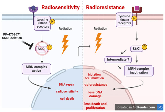 Supporting this idea is the fact that S6K1 is overexpressed and activated by tumor-promoting cell signaling pathways. For example, the PI3K/AKT/mTOR pathway is overactivated in cancer, and it is well known that this pathway activates S6K1. The overactivation of this pathway occurs in part by a downregulation of AKT inhibitors such as PTEN [29]. PTEN deficiency is observed often in cancer, which induces AKT activation. A previous study showed that this AKT activation has a suppressor role for DNA repair via S6K1, effects accompanied by a reduced expression of MRE11, RAD50, and NBS1 in colon cancer [19]. Thus, we hypothesize that PI3K/AKT/mTOR signaling could over activate S6K1, and then this kinase, either directly or by activating a downstream intermediate, could mediate DDR inhibition by impairing MRN signaling, allowing cells to accumulate aberrant mutations that increase radioresistance and malignancy (Figure 5).