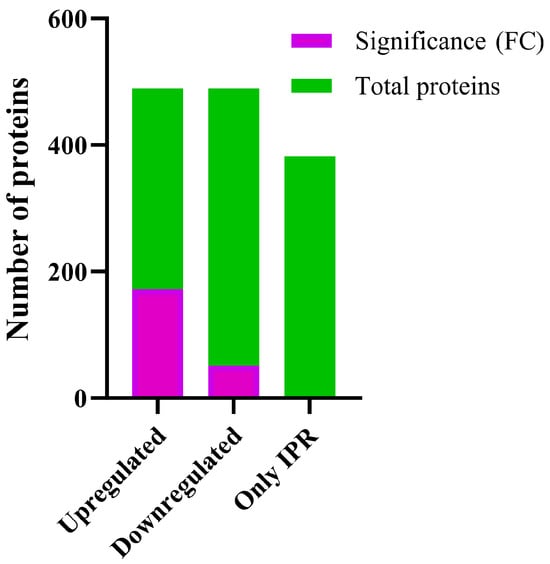 Differential expression of proteins of strain Pseudomonas sp. C9 in response to IPR treatment. Total: total number of proteins. Significance (FC): the threshold for differential expression was set as follows: upregulated proteins (≥1.21-fold change) and downregulated proteins (≤−1.21-fold change). Only IPR: proteins identified only in IPR treatment.