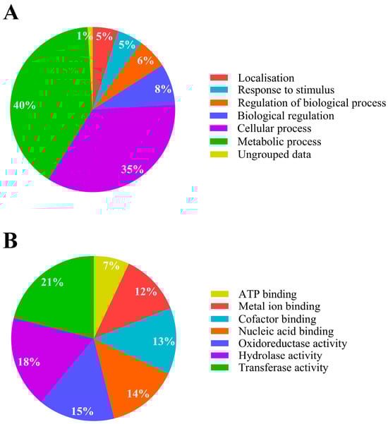 Metabolic activity analysis of Pseudomonas sp. C9 in response to iprodione. (A) Bacterial biological process; (B) bacterial molecular function. Modified from Blast2GO software [].