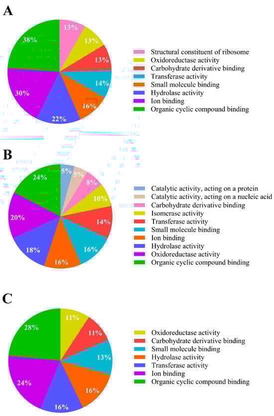 Molecular functional activity analysis of Pseudomonas sp. C9 in response to IPR. (A) Upregulated proteins; (B) downregulated proteins; (C) proteins expressed only in IPR treatment. Modified from OmicsBox software version 3.1 [].