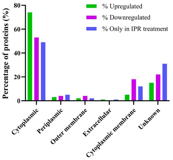 The 382 proteins expressed only in response to IPR treatment were analysed for their molecular function. We found that 47% of these proteins possess catalytic activity, with 11% having oxidoreductase activities, 16% having transferase activities, and 16% having hydrolase activities. Additionally, 39% possess binding activities, with 28% of these proteins binding to organic cyclic compounds (Figure 3C), including nucleic acids (DNA and RNA) and nucleotides. Like the up- and downregulated proteins, they are mainly located in the cytoplasm (Figure 4).