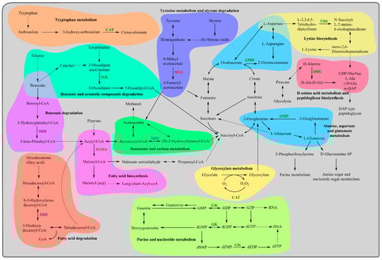 According to the KEGG® database, these proteins participate in 81 metabolic pathways, principally in the biosynthesis of secondary metabolites, two-component systems, microbial metabolism in diverse environments, biosynthesis of amino acids, and biosynthesis of cofactors (Table S2).