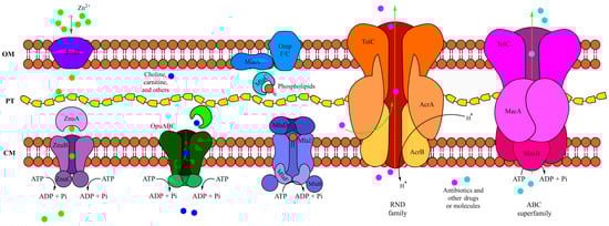 Schematic representation of transporters in Pseudomonas sp. C9. From left to right: Znu ABC import system, osmoprotectant uptake (Opu) system, Mla ABC transport system, RND family TolC AcrAB system, and ABC superfamily TolC MacAB outer membrane protein system [,,,,].