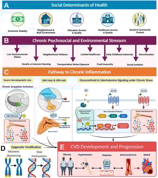 Social determinants of health (SDoH) account for SES in combination with other environmental and psychosocial factors that influence health and can play significant roles in disease development and progression []. SDoH factors are influenced by structural determinants of health or policies and systems put in place that dictate access to these resources (Figure 1A). For example, access to quality education and quality healthcare are structural determinants of health equity that are greatly influenced by SES (Figure 1A). Low SES, in combination with other SDoH factors, such as food insecurity, unsafe or insecure housing, neighborhood violence, limited medical accessibility, early childhood adversity, social isolation, and discrimination, can serve as a source of chronic stress that promotes a proinflammatory state resulting in health disparities (Figure 1B). For example, those with low SES are more likely to have lower incomes and live in disadvantaged communities, and their access to healthcare resources is limited, leading to diminished overall health [,] (Figure 1A,B). Elevated markers of inflammation such as CRP (C-reactive protein), sICAM-1 (soluble intercellular adhesion molecule-1), IL-6 (interleukin 6), and MCP-1 (monocyte chemoattractant protein 1) are often associated with health disparities observed in individuals exposed to chronic psychosocial stress and environmental stressors []. It has been established that these stressors activate the sympathetic nervous system (SNS) (Figure 1C). Activation of SNS axes such as sympatho-adrenomedullary (SAM) and the hypothalamic-pituitary-adrenal (HPA) then increases the levels of stress-related hormones such as cortisol and catecholamines among others, resulting in chronic inflammation []. In addition, chronic activation of SNS and HPA axes also results in glucocorticoid receptor resistance, thereby blunting anti-inflammatory response [] (Figure 1C). Such SDoH-influenced chronic inflammation often results in the accumulation of pathological epigenetic modifications and shorting of telomere length in individuals living in disadvantaged neighborhoods and has shown alteration of gene expression, particularly among genes involved in inflammatory pathways (Figure 1D). All these inflammatory processes lead to an increased risk of developing obesity, hypertension, diabetes, and atherosclerosis, ultimately contributing to major adverse health outcomes (Figure 1E). Hence, it is important to recognize that SDoH constructs contribute to biologic adversity experienced by an individual. Incorporation of SDoH-informed screening tools into clinical settings has the potential to significantly improve patient outcomes.