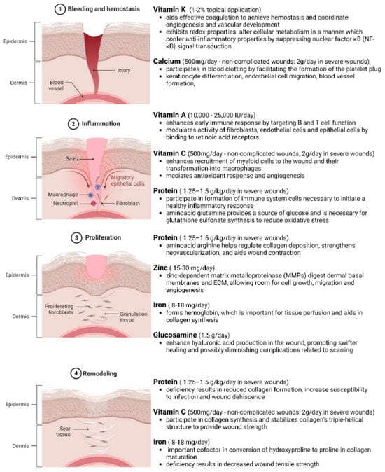 The B vitamins are cofactors for various biochemical reactions involved in leukocyte formation, immune response, and various other processes that occur during wound healing. Mochizuki et al. found that in diabetic mice, vitamin B supplementation resulted in accelerated wound closure and improved healing outcomes []. In total, eight B vitamin subtypes have been identified in the human body, and many are regular participants in wound healing. Vitamin B2 (riboflavin), vitamin B6 (pyridoxine), and vitamin B7 (biotin), for example, have been shown to play various roles in energy production, cellular migration and differentiation, and collagen synthesis []. In isolated riboflavin, pyridoxine, and biotin-deficient rats, it was seen that excision and incision wounds contracted at a much slower rate, held significantly less collagen content, and overall had impaired wound healing phases [].
