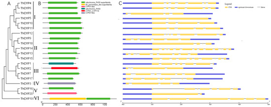 Phylogenetic relationship, domains, and gene structure analysis of ThCYPs. Note: (A) Phylogenetic tree of ThCYP proteins. (B) Domain analysis of ThCYPs. (C) Exon–intron structures of ThCYPs. The yellow box represents the exons; the black line represents the introns; the blue box represents the non-coding area. The horizontal axis represents the full length of the sequences.