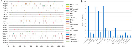 Analysis of cis-acting elements in the promoter regions of ThCYPs. Note: (A) Different colored boxes represent different cis-acting elements. (B) Most frequently predicted CAREs in the ThCYP promoter regions.