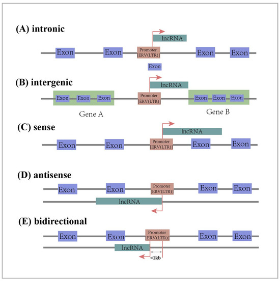 Progress has been made in understanding the origin and evolution of lncRNAs, and transposable element (TE) insertion has been found to be an important mode of lncRNA evolution [53]. In vertebrates, TEs occupy a large portion of the genome, most of which are transposed with the help of intermediate RNAs, mainly including endogenous retroviruses (ERVs), long interspersed nuclear elements (LINEs), short interspersed nuclear elements (SINEs), and DNA transposons [54,55,56]. In addition, TEs carry cis-regulatory elements such as promoters [57,58], enhancers [59], and transcription factor binding sites [60,61,62,63]. Further assessment of the impact of TEs on the cis-regulation of lncRNA genes revealed that TEs affect lncRNA transcription [64]. However, is the contribution of all TEs to lncRNAs the same? Kapusta and colleagues found TE enrichment in the first exon and upstream regions of human lncRNAs, and statistical analysis revealed that LTR/ERV contributed the most compared to other types of TEs [65]. The systematic assessment of the study suggests that ERV/LTRs are important players in the origin, diversification, and regulation of lncRNAs.