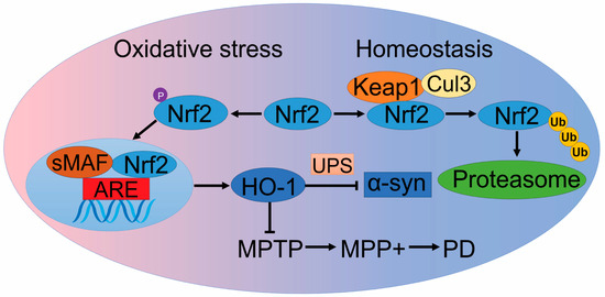 Under oxidative stress or specific conditions, Nrf2 translocates from the cytoplasm to the nucleus, where it forms a heterodimer with small MAF (sMAF) proteins and binds to the antioxidant response element (ARE) to activate a range of phase II detoxification genes, thus functioning as a major regulatory transcription factor (Figure 2). The beneficial role of Nrf2 in neurodegenerative conditions and the potential of specific Nrf2 activators as therapeutic agents are well-documented [62]. While the antioxidant functions of Nrf2 have been a primary focus, in vitro studies also show that Nrf2 accelerates the clearance of α-syn and mutant leucine-rich repeat kinase 2 (LRRK2) through the UPS [63]. As a transcription factor, Nrf2 exerts its neuroprotective effects by activating multiple protective genes involved in various molecular events of PD [64]. Among these genes, one notable candidate is heme oxygenase-1 (HO-1).