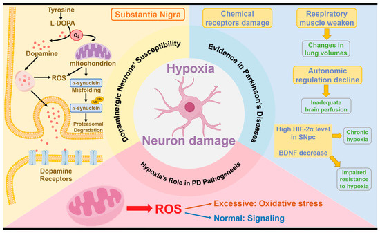 Hypoxia disrupts normal mitochondrial function at the cellular level, leading to increased oxidative stress and decreased energy production. This disruption causes an accumulation of ROS, which further damages brain tissue and accelerates neurodegeneration. Dopaminergic neurons are particularly vulnerable to hypoxia due to their close association with mitochondrial function. Notably, the accumulation of ROS can result in two distinct outcomes: extreme hypoxia leads to significant oxidative stress, while moderate oxygen deprivation acts as a signaling mechanism that enhances cellular resilience [96].