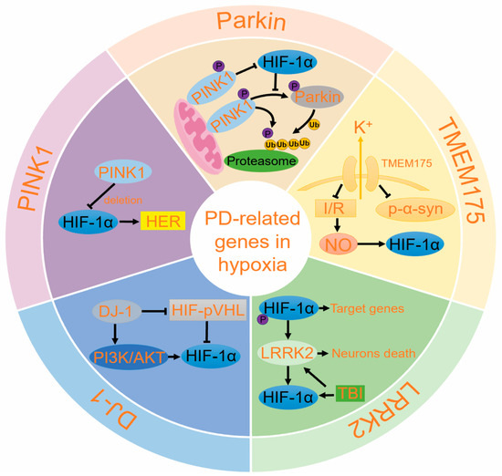 To date, over 20 genetic variations associated with PD have been identified, collectively accounting for about 5–10% of PD cases. Among these, mutations in genes encoding the proteins Parkin, PINK1, DJ-1, and TMEM175 can lead to autosomal recessive PD. These genetic mutations are closely related to PD risk and provide significant insights into its pathogenesis. Notably, several of these genes are linked to mitochondrial dysfunction and hypoxic responses (Figure 5) [123].