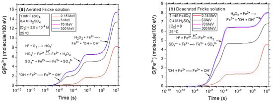 Time evolution of G(Fe3+) for incident proton energies of 300, 70, 6, and 0.15 MeV in the radiolysis of aerated (Panel (a)) and deaerated (Panel (b)) Fricke solutions at 25 °C, over the interval of 1 ps–200 s. These data are for no dose-rate effects (N = 1). In solutions containing 0.4 M H2SO4, a minor fraction of •OH radicals reacts with HSO4− to form the sulfate radical SO4•− (Reaction (4)). Despite this reaction, the overall yield of Fe3+ remains consistent with the predictions of Equations (10) and (11), SO4•− reacting with Fe2+ in a manner analogous to that of •OH (Reaction (5)) [].