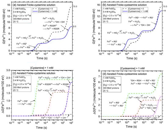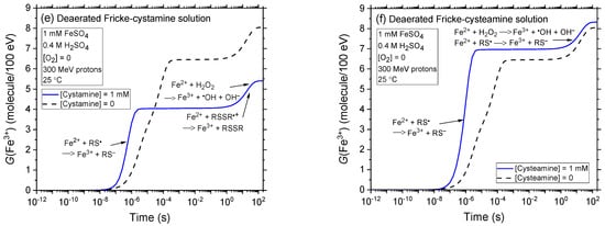 In Figure 2e,f, we present the kinetics of Fe3+ formation in the radiolysis of the Fricke solution containing 1 mM of either cystamine or cysteamine, under deaerated conditions, using our simulations with 300 MeV proton irradiation. The results are largely similar to those shown in Figure 2a,b, with a notable exception: under deaerated conditions, reaction (2), where H• atoms react with O2, does not occur.