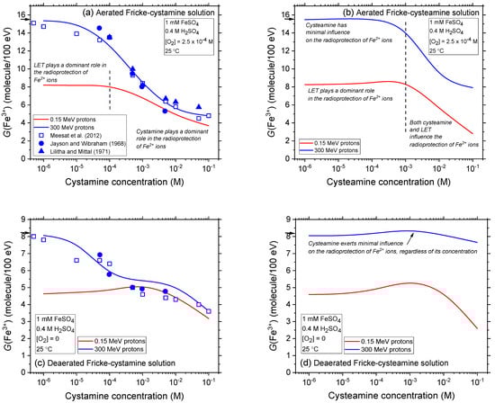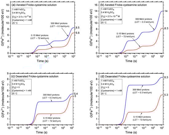 Figure 3a–c illustrates the impact of LET on the kinetics of Fe3+ ion formation during the radiolysis of Fricke solutions containing 1 mM of either cystamine or cysteamine, under aerated and deaerated conditions. Our simulations employed low-LET 300 MeV and high-LET 0.15 MeV irradiating protons. As depicted in Figure 3a,b, under aerated conditions, the G(Fe3+) value at ~200 s post-irradiation drops from ~8.5 to 6.8 molecules per 100 eV (a 1.7 G-unit decrease) with cystamine when LET increases from ~0.3 to 72 keV/μm. With cysteamine, the decrease is more pronounced, from ~14 to 8.3 molecules per 100 eV (a 5.7 G-unit drop). Figure 3c,d reveals similar trends under deaerated conditions. As discussed in Section 3.1, these observations are attributed to the enhanced role of intra-track processes in denser ionizing radiations, which limit the escape of free radicals from the radiation tracks, thereby reducing their availability to oxidize Fe2+ ions [,,,]. Importantly, LET significantly affects the radioprotection of Fe2+ ions in the radiolysis of Fricke-cystamine and Fricke-cysteamine solutions. However, at a concentration of 1 mM, LET is markedly less effective in reducing G(Fe3+) when cystamine is used as opposed to cysteamine, regardless of the oxygenation conditions.