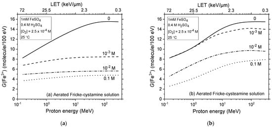 Remarkably, Figure 4a,c demonstrates that our calculated Fe3+ yields from low-LET 300 MeV (~0.3 keV/μm) incident protons accurately reproduce, without any adjustable parameters, the experimentally measured yields of Fe3+ for aerated and deaerated Fricke-cystamine solutions irradiated by X-rays and 60Co γ-rays, as reported in [,,]. This precise alignment between calculated and measured G(Fe3+) values at low LET strongly supports the accuracy and reliability of the chemical reaction scheme employed in this study for describing the radiation chemistry of cystamine and, by extension, cysteamine in these solutions.