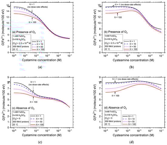 Figure 6a–d illustrate the impact of dose rate, quantified by N (the number of proton tracks per pulse; see Section 3.2.3) on the Fricke yields in the radiolysis of aerated and deaerated Fricke-cystamine and Fricke-cysteamine solutions, using low-LET 300 MeV irradiating protons and covering a broad range of cystamine or cysteamine concentrations, from 10−6 to 0.1 M. For this study, simulations were performed with N values of 1, 10, 50, and 100, where N = 100 corresponds to an absorbed dose rate of about 3 × 108 Gy/s under our irradiation conditions []. Data for N = 1, representing the history of a single proton track, i.e., indicating no dose-rate effects, are utilized as a reference.