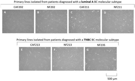 Phase-contrast images determine the morphology of isolated cell lines ((A) CAF 202, (B) NF202, (C) CAF211, (D) NF211, (E) CAF213, (F) NF213, (G) NF235). They represent an elongated, spindle-like shape morphology corresponding to a fibroblast-like phenotype. Pictures were taken at 100× magnification.