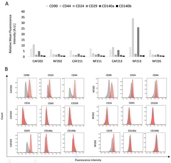 Flow cytometric analysis of the phenotype of isolated CAF and NF lines. The biomarker expression indicates specific cell line characteristics, confirming its phenotype and molecular subtype. For cell phenotyping, CD90, CD44, CD24, CD29, CD140a, and CD140b biomarkers were used. (A) Plot of each cell line’s relative mean fluorescence intensity of selected biomarkers. (B) Representative histograms of CAF and NF isolated from the same patient (no. 202) show the fluorescence intensity level. The gray histogram determines unstained cells (negative group), while the red one marks labeled cells with a specific antigen. The presented results are based on a single experiment.