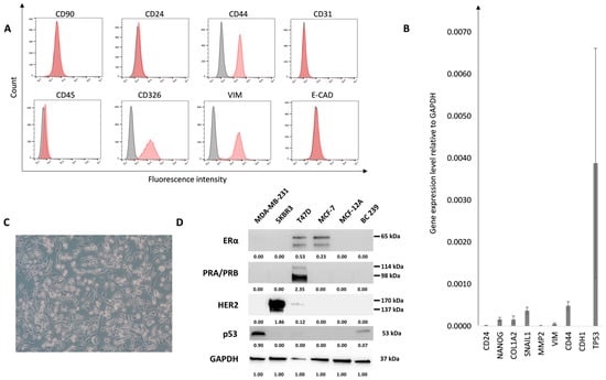 Characterization of the BC239 cell line. (A): The BC239 line confirmation of BC origin using flow cytometry. The lack of CD90, CD31, and CD45 expression demonstrated exclusion of fibroblast, leukocyte, and endothelial features. The presence of CD44, CD326, and VIM and the lack of E-CAD and CD24 show the increased mesenchymal-like population with a high content of CSC originating from the epithelium. Grey histograms represent isotype control and red histograms correspond to the staining antigen of interest. (B): The relative gene expressions of the BC239 line. The genes characteristic for BC cells and TME were chosen. (C): The microscopic evaluation of BC239 cells showing spindle-like morphology. The pictures were taken using an inverted microscope Axio Vert.A1 (Carl Zeiss, Germany). Magnification ×100. (D): The evaluation of receptor status and p53 expression of the isolated primary breast cancer cell line using the Western blot technique. The blots represent the status of ERα, PRA/PRB, HER2 receptors, and p53 in commercially available breast cancer cell lines (MDA-MB-231, SKBR3, T47D, MCF-7), normal epithelial breast cell line (MCF12A), and the primary breast cancer cell line (BC239). GAPDH was used as a loading control. Below the blots, the signal intensity values normalized to GAPDH are shown.