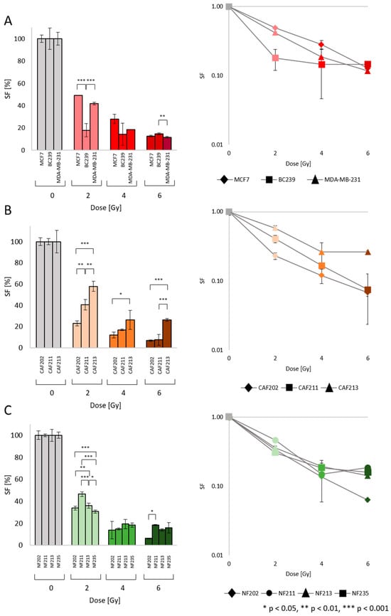 Cell survival fraction (SF) post proton IRR. All cell lines were irradiated with 2, 4, and 6 Gy doses. The column graphs (left side) show the statistically significant differences between the cell lines for each dose. The curve plots (right side) were determined to illustrate the exponential dependency between the SF and dose. The various cell lines were: BC (A) (red), CAF (B) (orange), and NF (C) (green). The p-value was adjusted to * p < 0.05, ** p < 0.01, and *** p < 0.001. The values presented in the graph are the mean of the obtained results and the deviation is the standard deviation. The experiment was performed in triplicate.