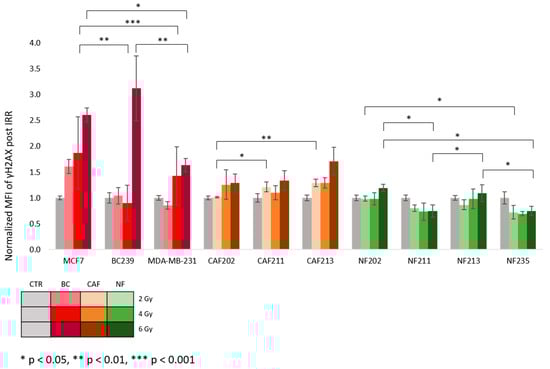 The mean fluorescence intensity (MFI) of γH2AX 1 h post proton IRR. After IRR, the γH2AX was labeled to indicate DNA (DSB). Cells were irradiated using doses of 2, 4, and 6 Gy. The results were compared between different cell lines, and each dose was analyzed. Various cell lines were: BC (red), CAF (orange), and NF (green). The p-value was adjusted to * p < 0.05, ** p < 0.01, and *** p < 0.001. The values presented in the graph are the mean of the obtained results and the deviation is the standard deviation. The experiment was performed in triplicate.