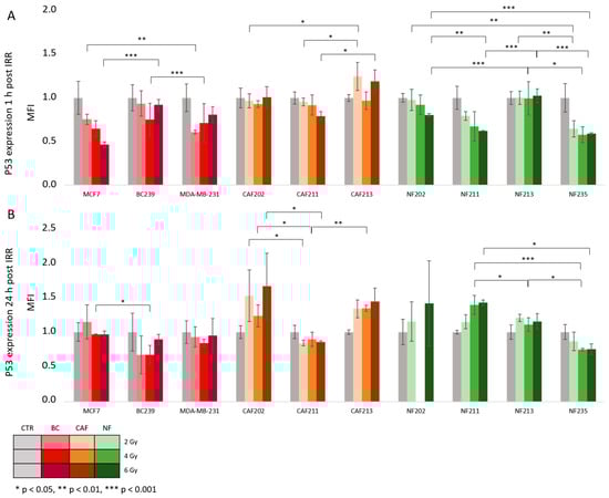 p53 expression 1 h (A) and 24 h (B) post IRR. All cells were irradiated with a proton beam using 2, 4, and 6 Gy doses. The results were compared between different cell lines analyzing each dose. A p53 value for NF202, 24 h post-IRR with a dose of 4 Gy, was missing because of the cell lack. Various cell lines were irradiated with a proton beam: BC (red), CAF (orange), and NF (green). The p-value was adjusted to * p < 0.05, ** p < 0.01, and *** p < 0.001. The values presented in the graph are the mean of the obtained results and the deviation is the standard deviation. The experiment was performed in triplicate.