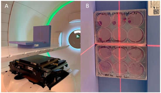 An example of an experiment that was set-up for cell IRR using a proton beam. This Solid Water® High Equivalency phantom model enables IRR of cells cultured in 12- and 6-well plates. (A): Side view of positioned measurement set-up, (B): Top view of positioned measurement set-up.